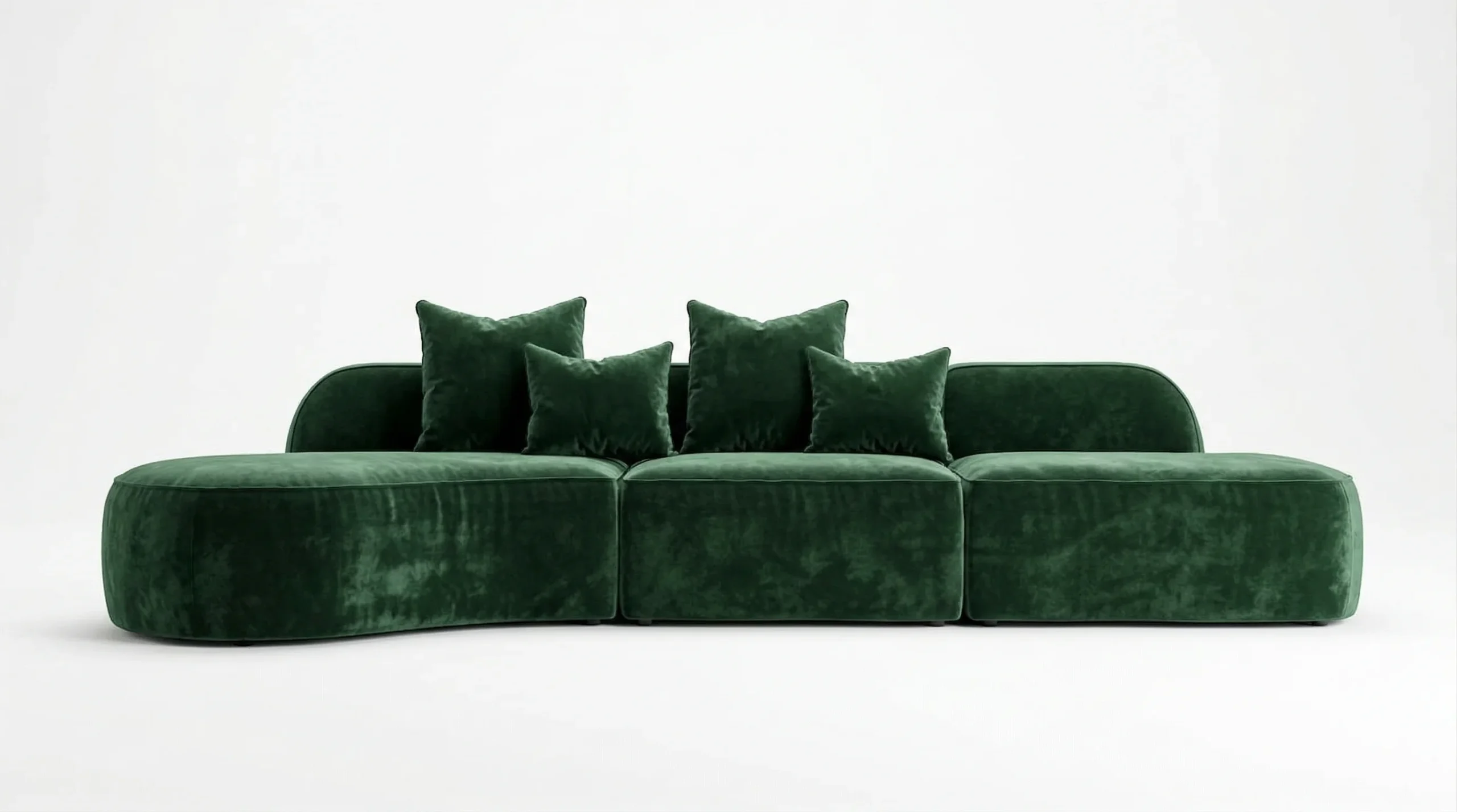 De Mura Emerald is geen meubel, het is een sculptuur. Met haar gedurfde, organische lijnenspel en de diepe, weelderige gloed van koninklijk groen fluweel, herdefinieert ze de betekenis van een statement piece. De naadloze, modulaire vormen doen denken aan een luxueuze omhelzing, terwijl de rijke textuur een ongeëvenaarde allure uitstraalt. Dit is een ontwerp dat niet alleen de ruimte vult, maar deze ook domineert met een zachte, tijdloze dominantie.